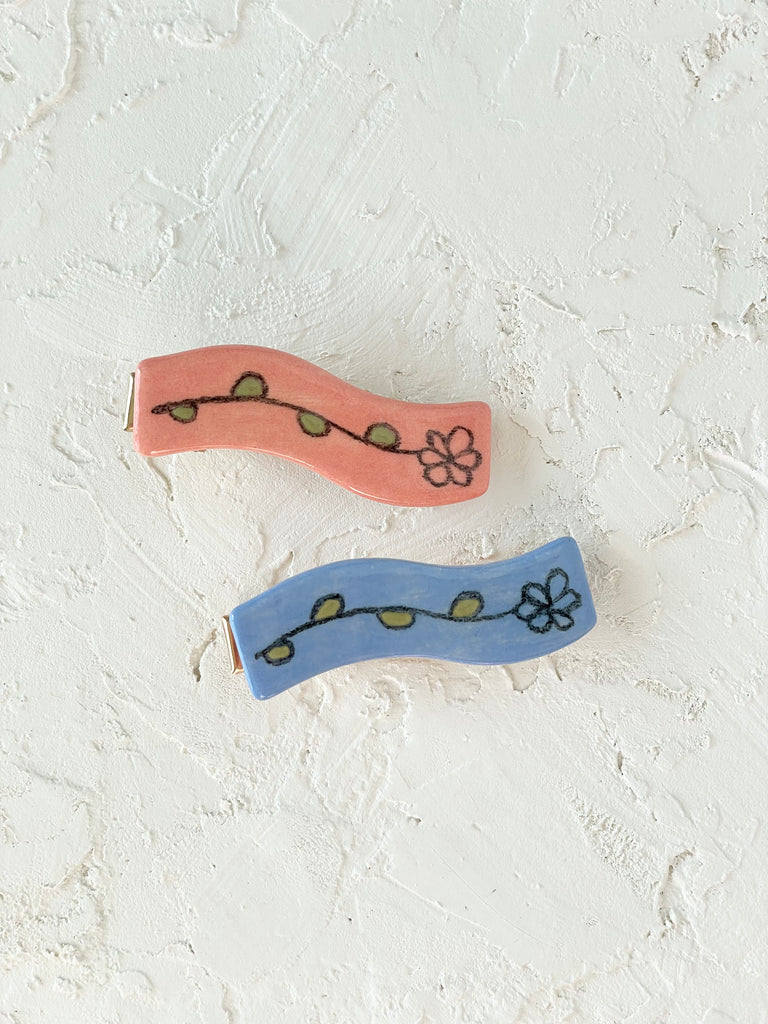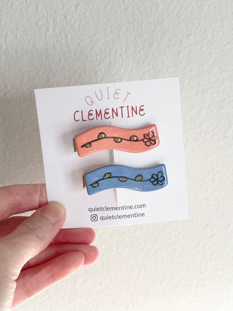 Make a statement with this floral hair clip set! Crafted from ceramic with illustrated flowers, these fun clips will bring a playful touch to any look. They're attached to alligator clips with teeth, making them the perfect fine hair accessory for a little added flair.